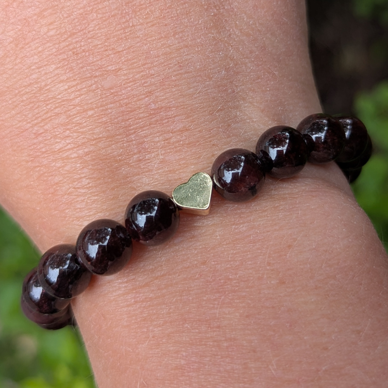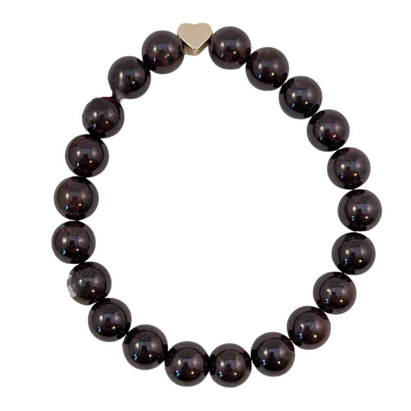 Handgjort armband / mala skapat av stenpärlor i Röd granat, tillsammans med ett hjärta i guldig metall