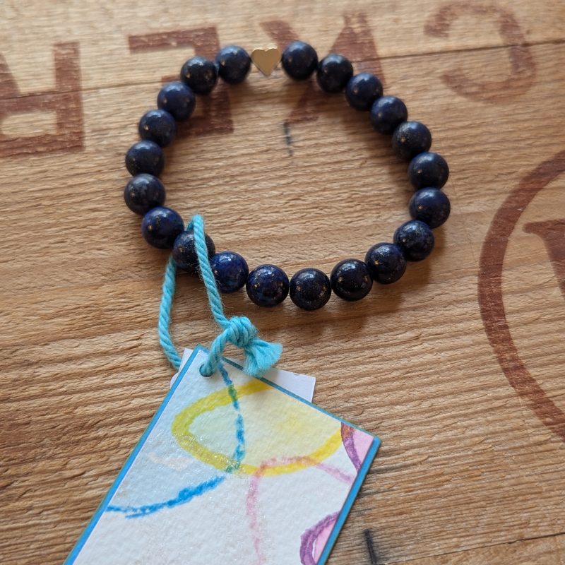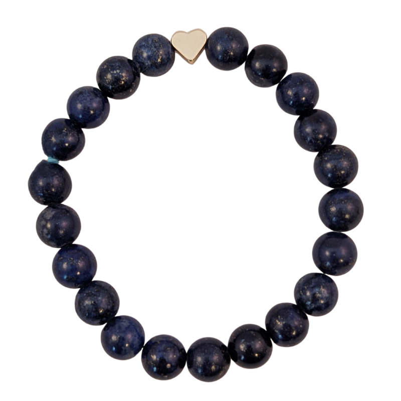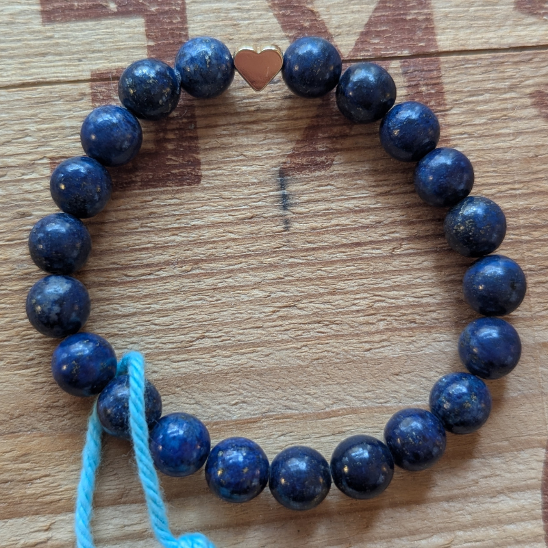 Handgjort armband / mala skapat av Lapis Lazuli, tillsammans med ett hjärta i guldig metall
