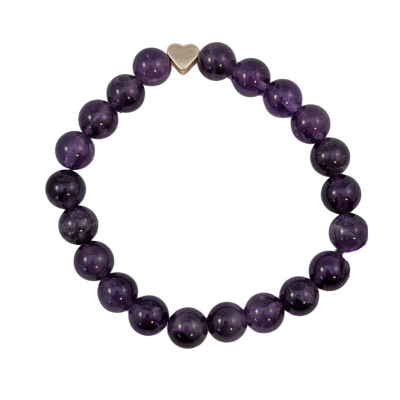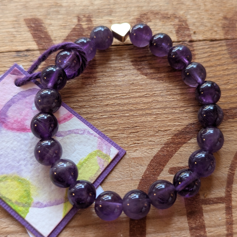 Handgjort armband / mala skapat av Ametist, tillsammans med ett hjärta i guldig metall