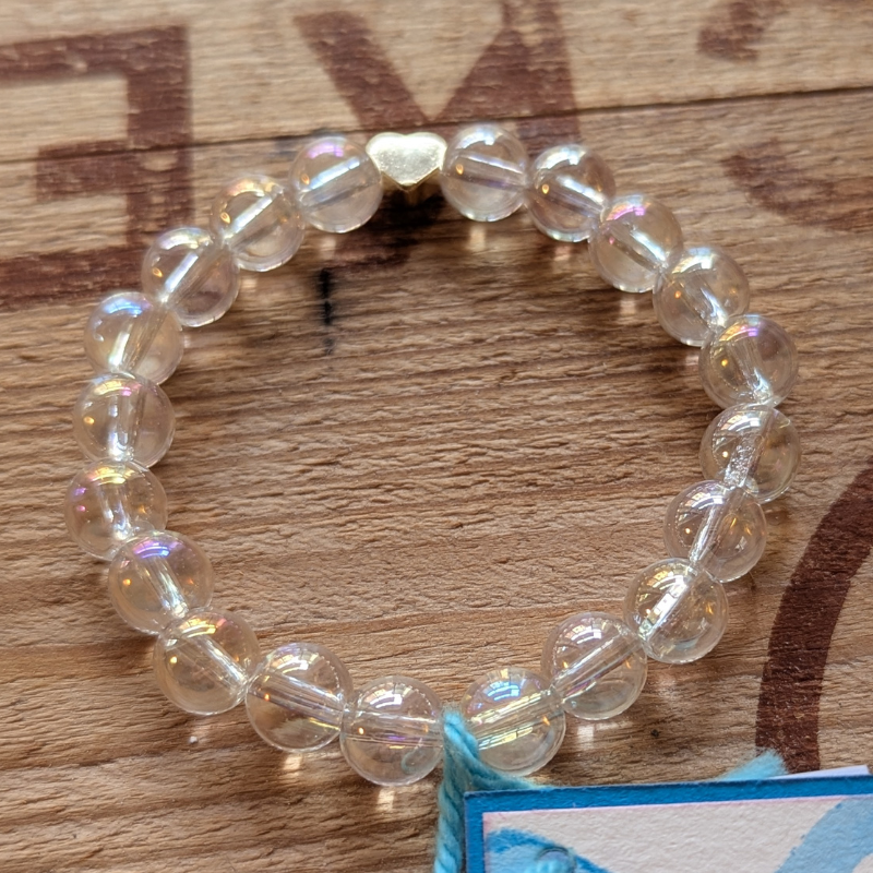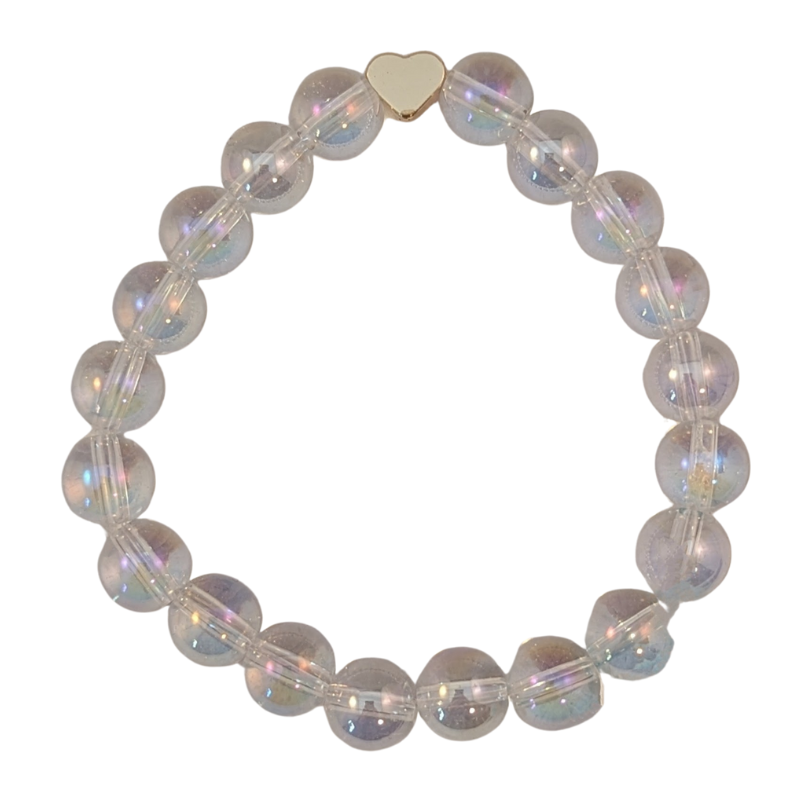 Handgjort armband / mala skapat av Ängelkvarts / Bergskristall Aurora Borealis, tillsammans med ett hjärta i guldig metall