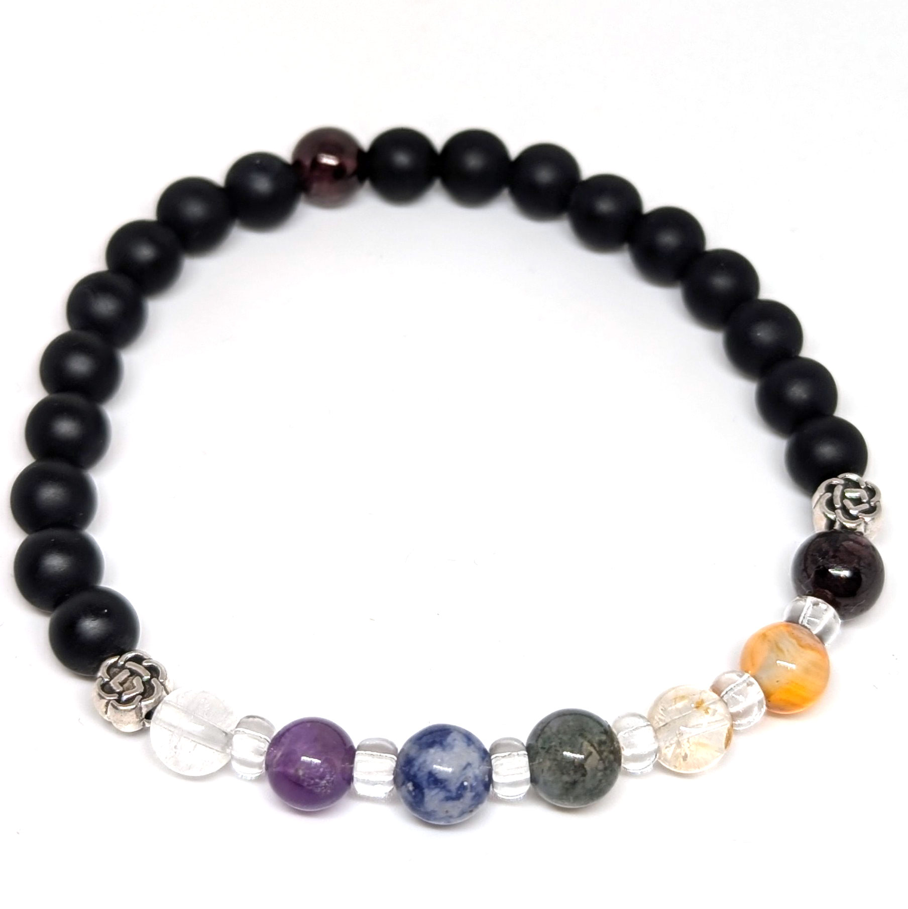 Armbandets baksida består av Svart Agat och en Röd Granat, två stenar som tillsammans skapar en balanserande energi – lugnande, men ändå kraftfull.