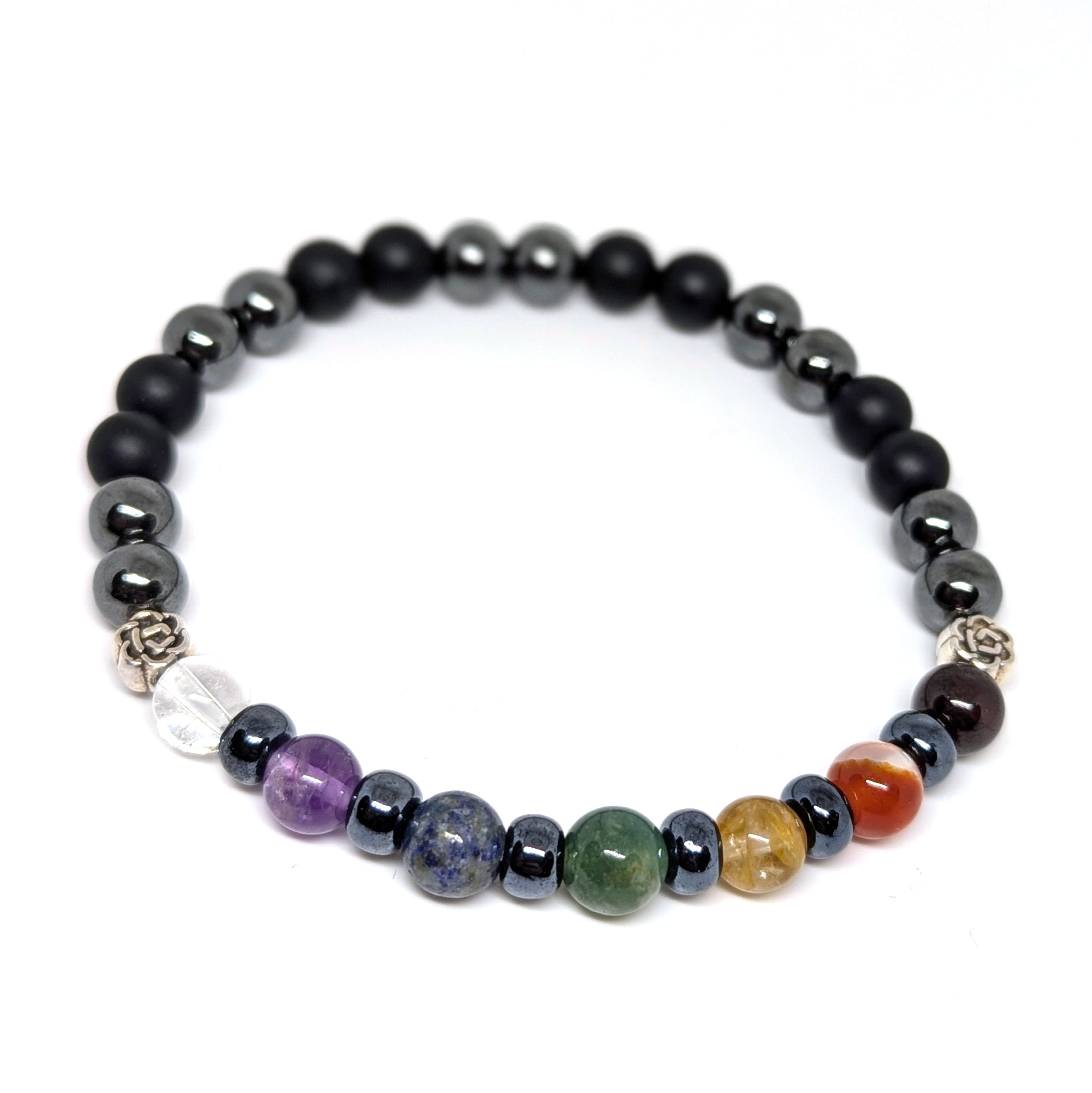 Armbandets baksida består av Svart Agat och en Hematit, stenar som tillsammans ger en stark jordning och emotionell stabilitet.